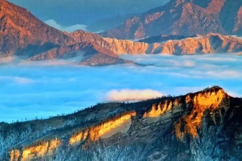 雪山、佛光、彩虹、霞光应有尽有。白色的云雾,弥漫在群山之间,日出后,即可看见远山金黄,美好的早晨便从美好的场景中开始了。