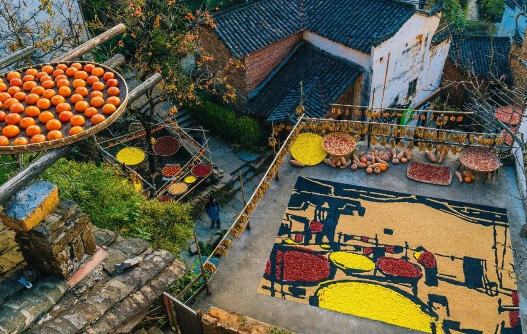 白墙青瓦的徽派建筑与满载的簸箕相应成章