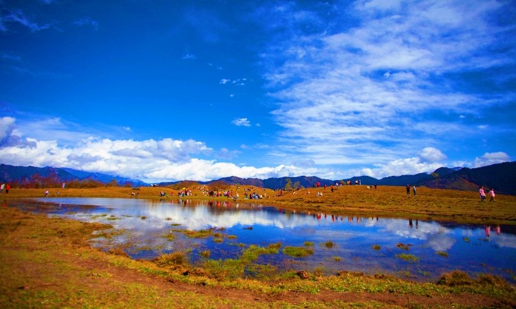 预计10:30到达下车点,乘坐中转车前往徒步起点(中转费往返30元/人,卫生费14元/人),开始徒步,一路拾阶而上,欣赏秋天的甘海子,金黄色的草甸,远看云雾缭绕。中午在山顶的高原海子边,就着淡淡的牛屎清香,享用自带豪华路餐,在蓝天下、白云里继续放飞自己,拍摄美照,玩够了原路返回,下午16:30按约定时间集合上车回程.