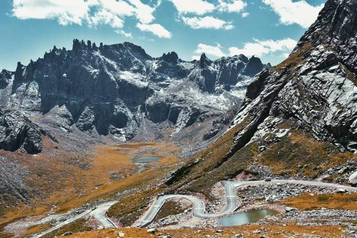 从阿坝县到莲宝叶则45公里,一路在山谷里,蜿蜒曲折,翻滚的河流在路边,陡峭的山崖在两岸。